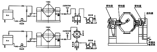 工作原理: 在密閉的夾層中通入熱能源(如熱水,低壓蒸汽或?qū)嵊?,熱量經(jīng)內(nèi)殼傳給被干燥物料。在動(dòng)力驅(qū)動(dòng)下,罐體作緩慢旋轉(zhuǎn),罐內(nèi)物科不斷地混合,從而達(dá)到強(qiáng)化干燥的目的。 物料處于真空狀態(tài),蒸汽壓下降使物料表面的水份(溶劑)達(dá)到飽和狀態(tài)而蒸發(fā)了,并由真空泵及時(shí)排出回收。物料內(nèi)部的水份(溶劑)不斷地向表面滲透、蒸發(fā)、排出,三個(gè)過程不斷進(jìn)行,物料在很短時(shí)間內(nèi)達(dá)到干燥目的。 |